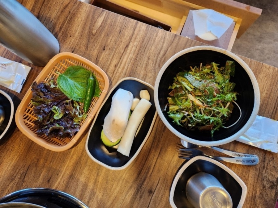 기본찬도 꽤 종류가 많았어요. 명이나물, 파무침, 깻잎/ 상추쌈, 무절임, 김치, 무 장아찌까지 반찬들도 다 맛있었어요.